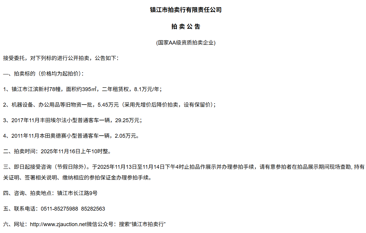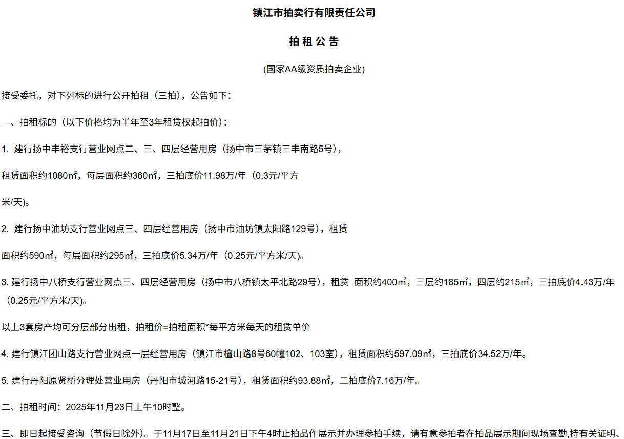鎮江市拍賣行有限責任公司拍 租 公 吿(國家AA級資質拍賣企業)接受委托,對下列標的進行公開拍租(三拍),公告如下:—、拍租標的(以下價格均為半年至3年租賃權起拍價):1.  建行揚中豐裕支行營業網點二、三、四層經營用房(揚中市三茅鎮三豐南路5號),租賃面積約1080㎡,每層面積約360㎡,三拍底價11.98萬/年(0.3元/平方米/天)。2.  建行揚中油坊支行營業網點三、四層經營用房(揚中市油坊鎮太陽路129號),租賃面積約590㎡,每層面積約295㎡,三拍底價5.34萬/年(0.25元/平方米/天)。3. 建行揚中八橋支行營業網點三、四層經營用房(揚中市八橋鎮太平北路29號),租賃  面積約400㎡,三層約185㎡,四層約215㎡,三拍底價4.43萬/年(0.25元/平方米/天)。以上3套房產均可分層部分出租,拍租價=拍租面積*每平方米每天的租賃單價4. 建行鎮江團山路支行營業網點一層經營用房(鎮江市檀山路8號60幢102、103室),租賃面積約597.09㎡,三拍底價34.52萬/年。5. 建行丹陽原賢橋分理處營業用房(丹陽市城河路15-21號),租賃面積約93.88㎡,二拍底價7.16萬/年。二、拍租時間:2025年11月23日上午10時整。三、即日起接受咨詢(節假日除外)。于11月17日至11月21日下午4時止拍品作展示并辦理參拍手續,請有意參拍者在拍品展示期間現場查勘,持有關證明、簽署相關說明、繳納相應的參拍保證金辦理參拍手續。四、咨詢、拍租地點:鎮江市長江路9號五、聯系方式:0511-85275988   13655299933楊先生六、網址:http://www_zjauction_net.fremaengel.com;微信公眾號:搜索“鎮江市拍賣行” 拍品清單2025.11.23序號名稱起拍價(元)標的說明1建行揚中豐裕支行營業網點二、三、四層經營用房(揚中市三茅鎮三豐南路5號),租賃面積約1080㎡,每層面積約360㎡三拍底價11.98萬/年(0.3元/平方米/天)1、1-3號房產均可分層部分出租,拍租價=拍租面積*每平方米每天的租賃單價;2、意向競拍人在拍賣前需持營業執照或身份證與委托方說明租賃房產經營業態,確定意向后出具房產承租用途承諾書,經委托方審核后,方可交納保證金參加競拍;3、租賃期限為半年至3年(承租方與出租方協商而定),承租方每半年或一年結付租金,租賃期間的水、電費用及其它相關費用均由承租方承擔;4、承租方不得用于經營和保管危險物品,不得用于開設餐飲、娛樂等可能嚴重影響消防安全、運營安全的經營業態,不得用于經營委托貸款、小額貸款等可能冒用委托方名義,帶來聲譽風險的經營業態。租賃期內,承租方不得破壞墻體結構,自行成就消防、安全等使用條件,不得擅自將租賃房屋轉租、轉讓給他人使用,否則委托方有權收回房屋;5、拍租成交后,承租方將租金交至出租方指定賬戶,傭金交至拍賣方賬戶(拍租傭金為該房屋一個月租金)。承租方憑租賃合同無息退還保證金。2建行揚中油坊支行營業網點三、四層經營用房(揚中市油坊鎮太陽路129號),租賃面積約590㎡,每層面積約295㎡三拍底價5.34萬/年(0.25元/平方米/天)3建行揚中八橋支行營業網點三、四層經營用房(揚中市八橋鎮太平北路29號),租賃面積約490㎡,每層面積約245㎡三拍底價4.43萬/年(0.25元/平方米/天)4建行鎮江團山路支行營業網點一層經營用房(鎮江市檀山路8號60幢102、103室),建筑面積約597.09㎡三拍底價34.52萬/年5建行丹陽原賢橋分理處營業用房(丹陽市城河路15-21號),建筑面積約93.88㎡二拍底價7.16萬/年